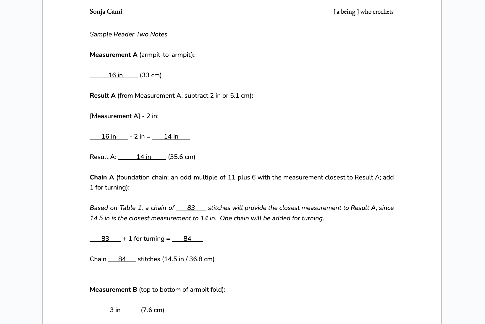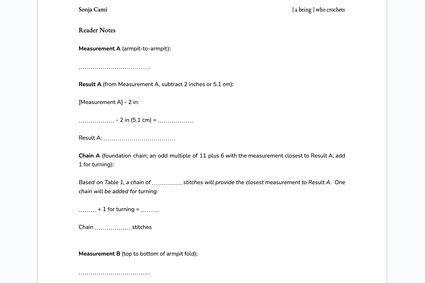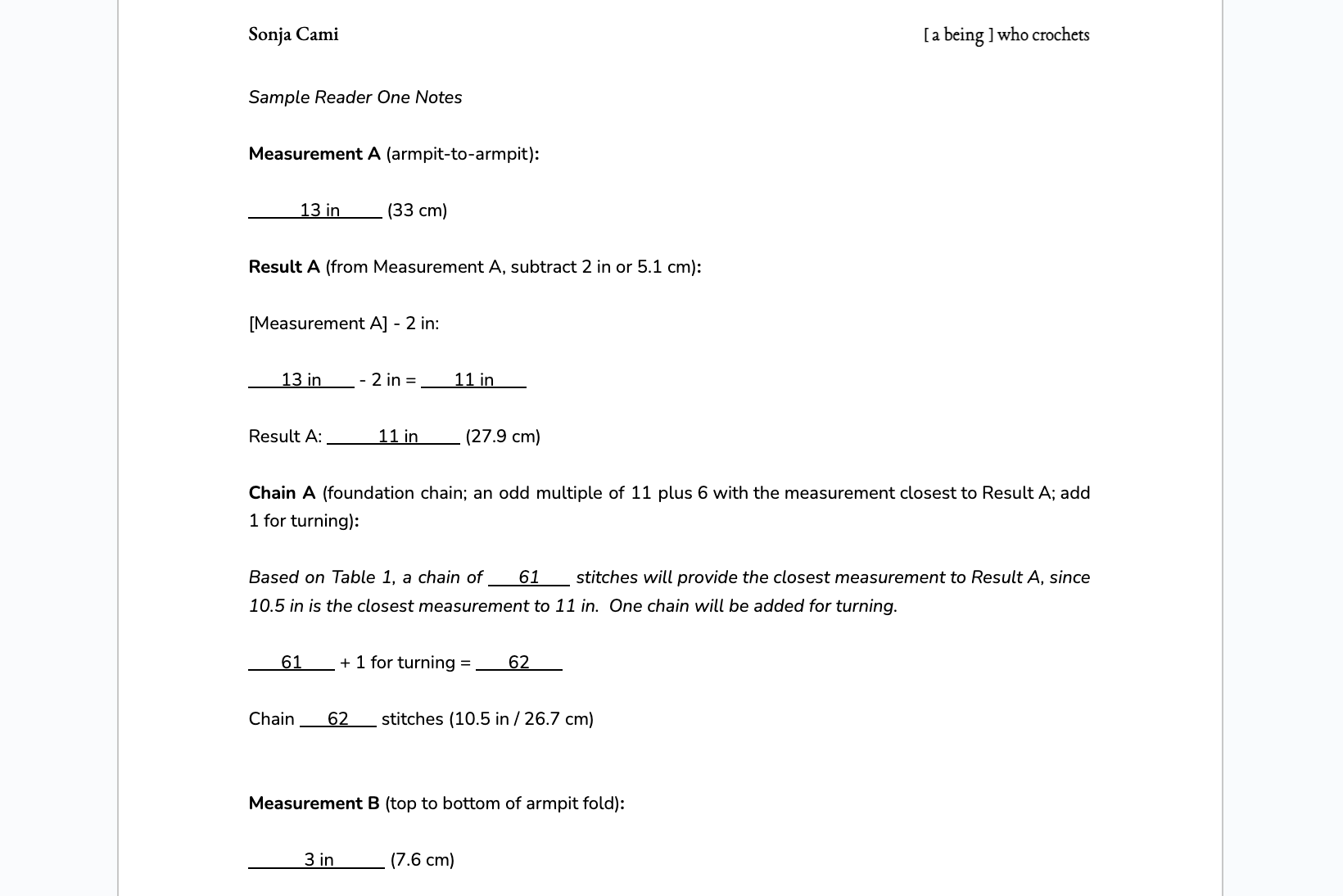 Reader Notes: The Reader Notes function as a preparatory worksheet where you can write down any critical measurements, calculations, and design choices before working the pattern. It is recommended that you take about 10 minutes to complete this worksheet first. This way, the actual construction and crochet process is kept streamlined and relatively uninterrupted.